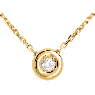 Ein funkelnder Diamant lieblich eingefasst in einen zarten Rahmen aus Gelbgold. Mit Goldkette 750/1000: 40cm. Mit Kette 42 cm + Verlängerung von 3 cm; 750/-. 1 Diamant : 0.05 Karat - Gelbgold (750/-): 1.9 g. Weitere Abmessungen