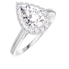 Der Ring besitzt einen 0,5 Karat großen Birnen-Labordiamanten und einen Halo aus 18 synthetischen Diamanten mit insgesamt 0,636 Karat.