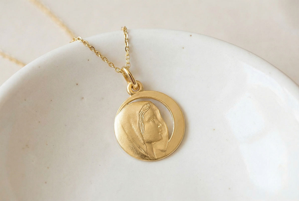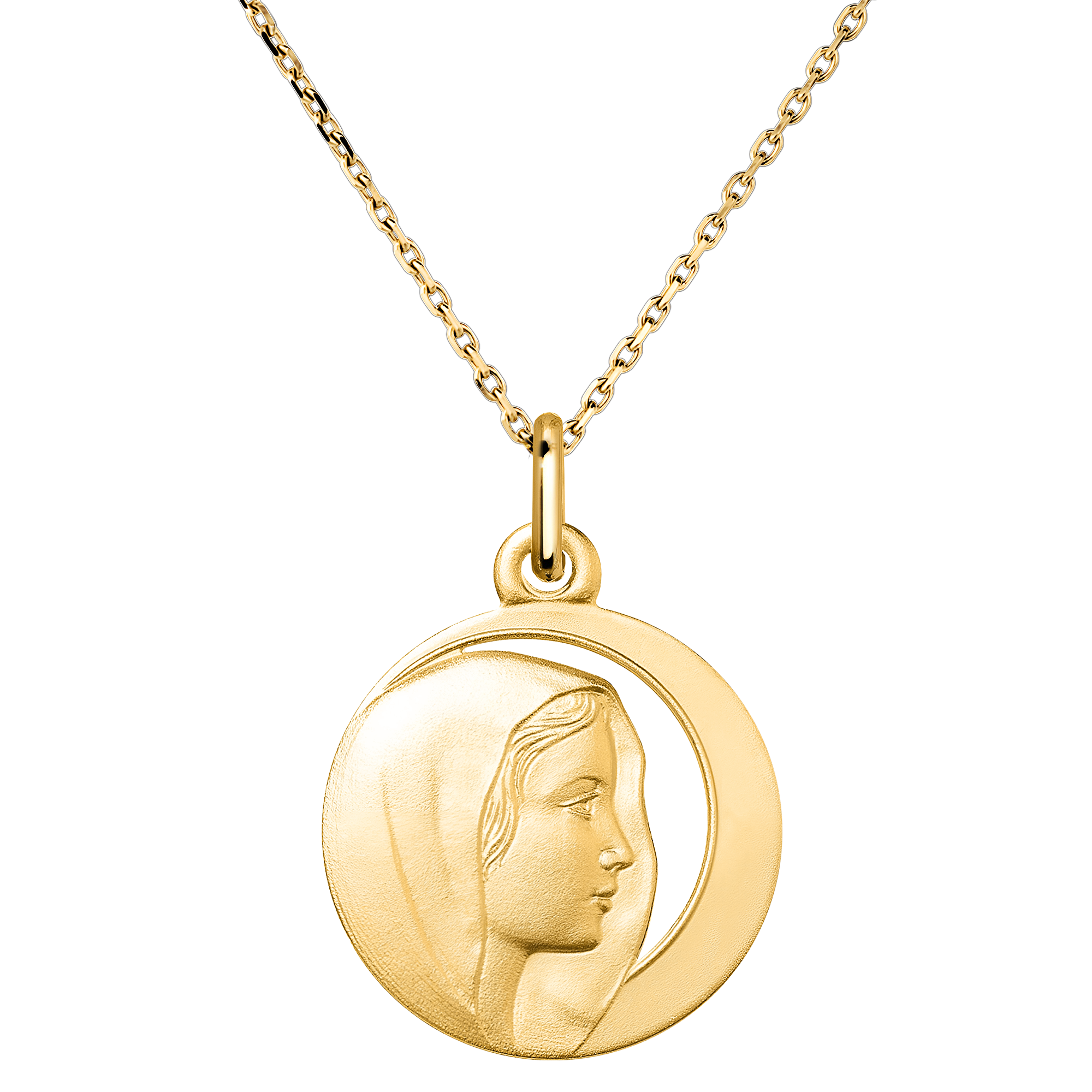 Diese durchbrochene Medaille aus Gelbgold zeigt das zarte Profil der Jungfrau Maria, umgeben von einem Heiligenschein, der Reinheit und göttliches Licht symbolisiert. Das durchbrochene Design mit seiner sanften und klaren Silhouette verleiht moderne Eleganz und bewahrt gleichzeitig die spirituelle Tiefe. Ein perfektes Schmuckstück für eine Taufe, Kommunion oder einen Moment des Glaubens, das mütterlichen Schutz und göttliche Güte verkörpert. Material: 9-karätiges Gelbgold (375/1000). Durchmesser: 18 mm. Finish: Sandgestrahltes Relief mit durchbrochenem Heiligenschein. Personalisierbare Gravur auf der Rückseite. In einem edlen Etui geliefert, bereit, als Symbol des Glaubens und des Lichts zu verschenken. Ohne Kette. Gelbgold (375/-): 1.6 g. Weitere Abmessungen