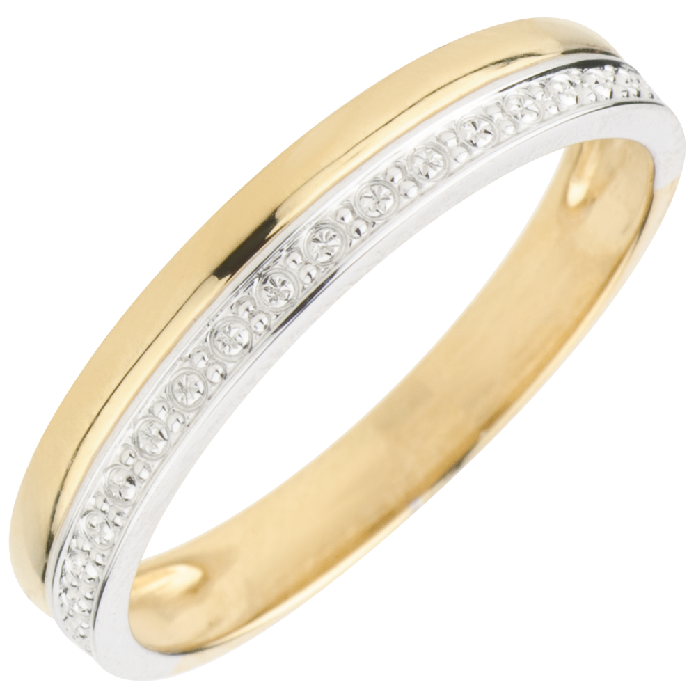 Dieses gelbgoldene Band harmoniert auf perfekte Weise mit einer weißgoldenen Borde, deren Oberflächer diamantartig verarbeitet ist. Das Duo sorgt für ein Maximum an Brillanz und wirkt zeitlos elegant. Weiß-und Gelbgold (375/-): 1.7 g. Weitere Abmessungen