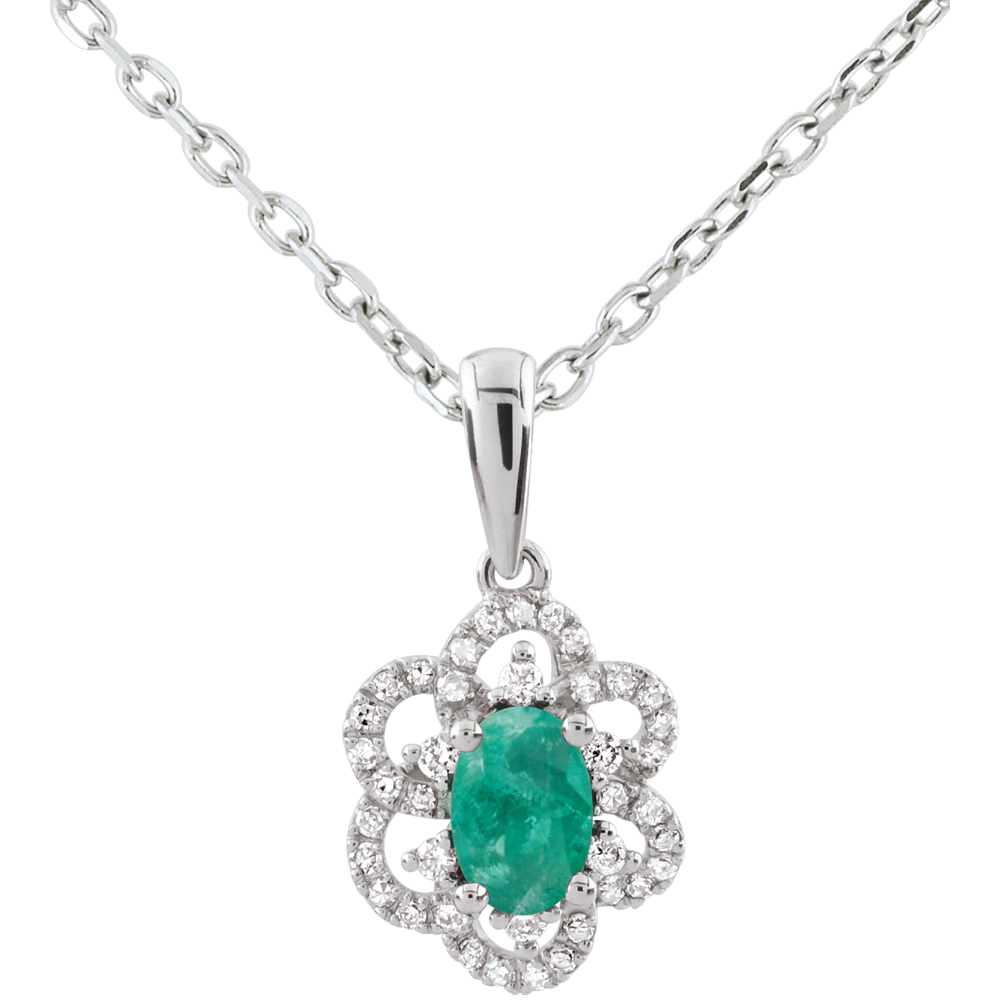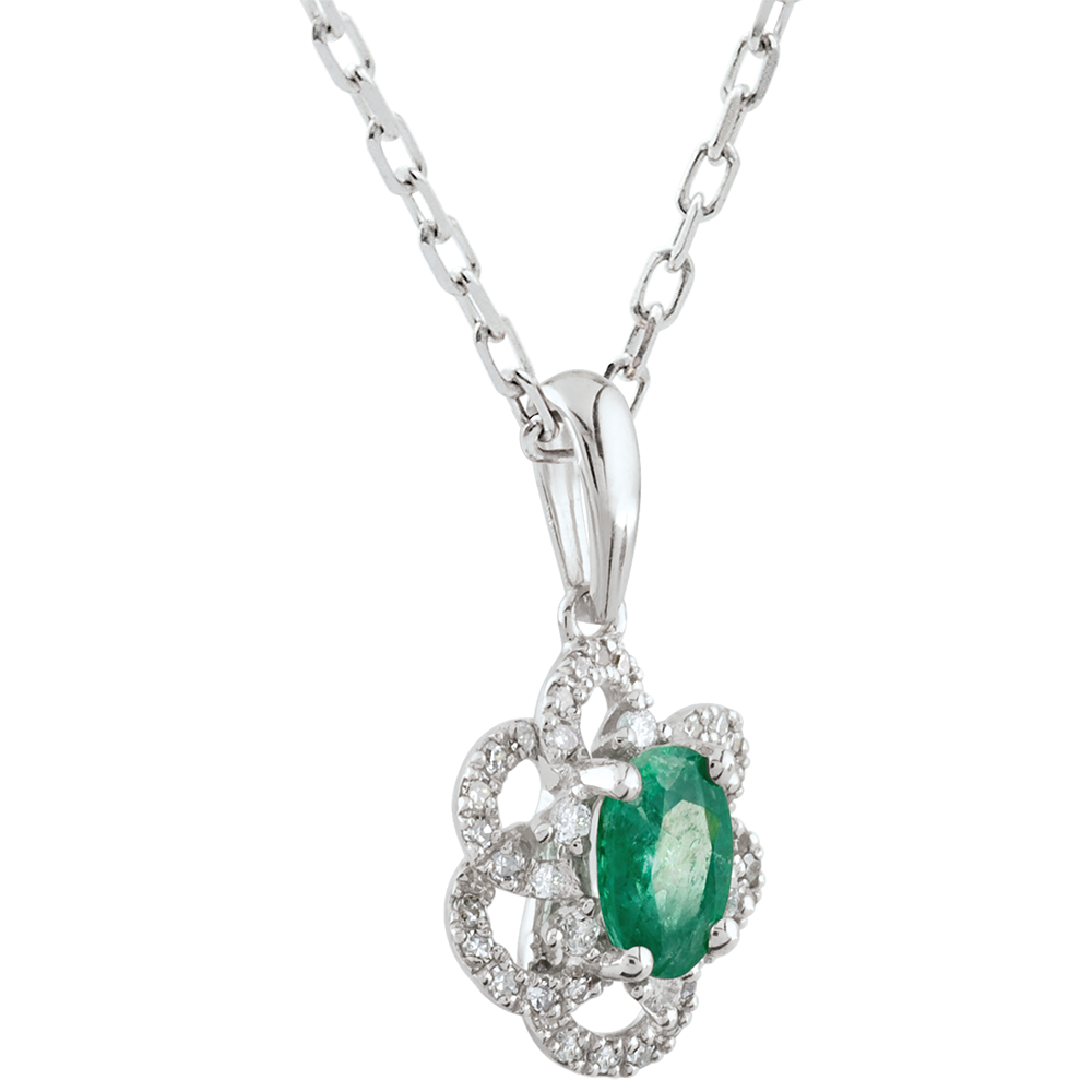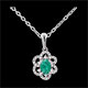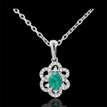 Eine köngliche Margerite, reicht verziert mit Diamanten und einem prächtigen Smaragd. Ohne Kette. 46 Diamanten : 0.17 Karat - Weißgold (375/-): 0.8 g. Smaragd : 1 - Total: 0.43 Karat Weitere Abmessungen