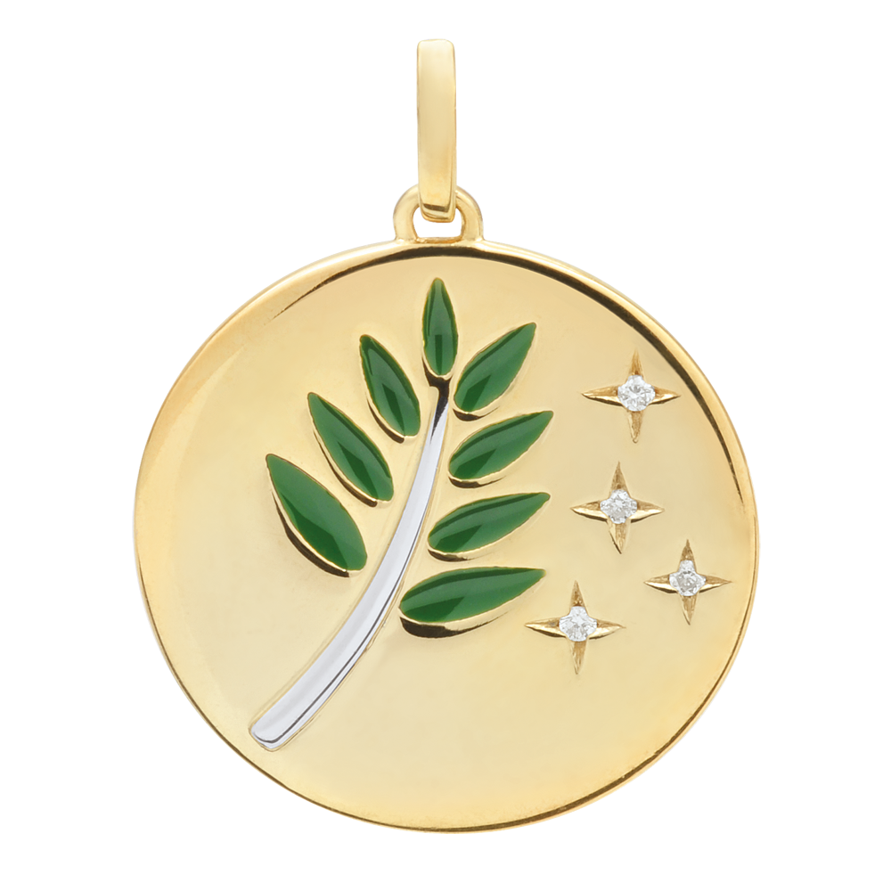 Ein moderner Anhänger, der seinen Besitzer in jeder wichtigen Phase seines Lebens begleiten wird. Motivdicke: 1.3 mm. Ohne Kette. 4 Diamanten : 0.02 Karat - Weiß-und Gelbgold (750/-): 3.1 g. Weitere Abmessungen
