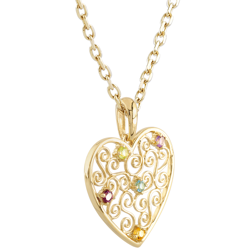 Ein luftiges Herz aus Gold, besetzt mit Farbsteinen.