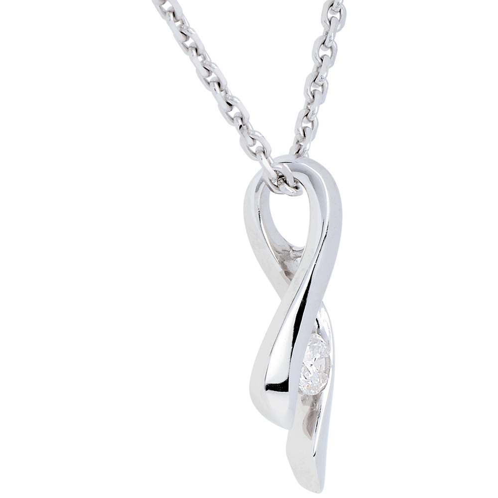 Dieser verschlungene Anhänger aus Weissgold verziert mit einem funkelnden Diamanten wirkt endlos.
