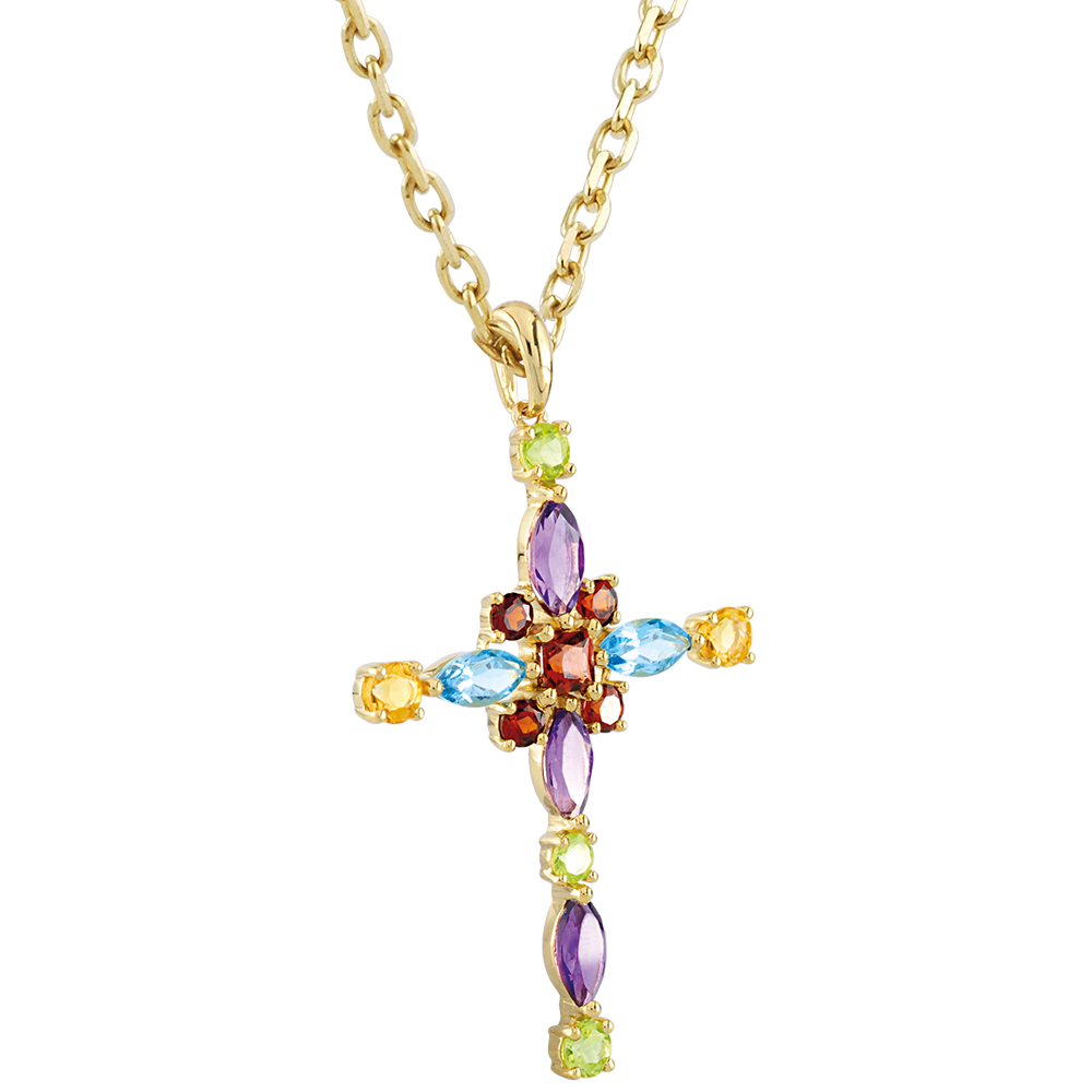 PARADIESVOGEL NR. 8Anhänger Kreuz - Gelbgold 375/-(9Kt) - Citrin gelb, Blauer Topas, Amethyst, Olivine, Granat ID : 2275 4.9 (23)