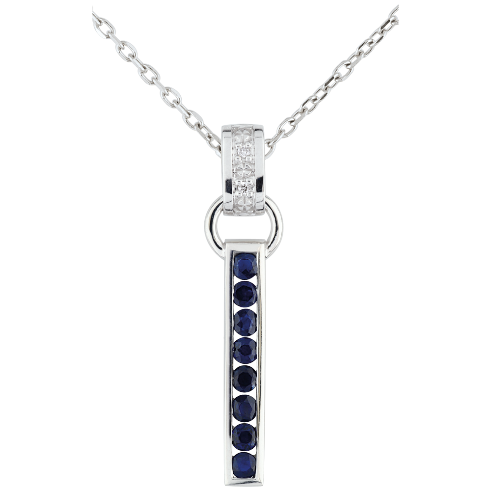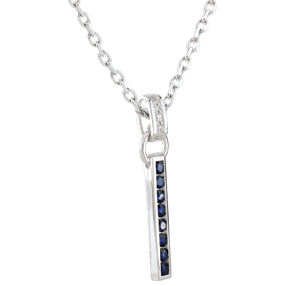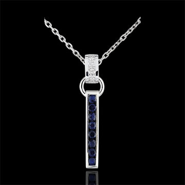 Ein Band von Saphiren - elegant und zeitlos. Gehalten wird das Band von einem mit Diamanten besetzte Ring. Ohne Kette. 2 Diamanten : 0.01 Karat - Weißgold (375/-): 1.2 g. Blauer Saphir : 8 - Total: 0.72 Karat Weitere Abmessungen