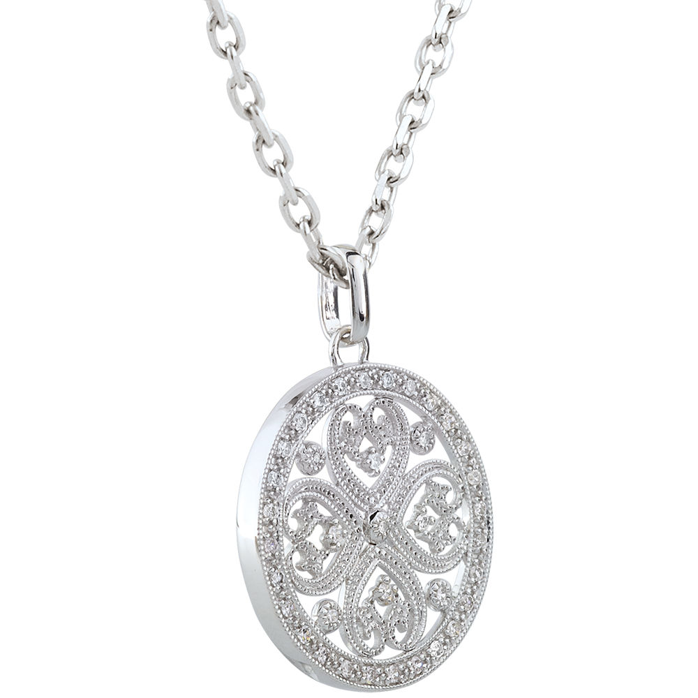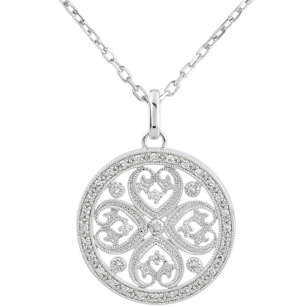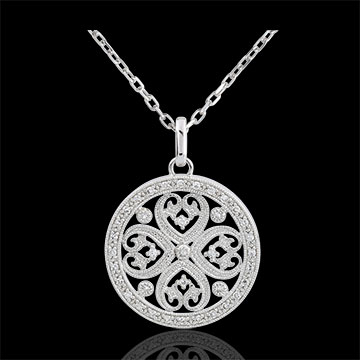 Raffinesse, Weiblichkeit und Unendlichkeit beschreiben dieses Schmuckstück. In seinem inneren trägt dieser Anhänger ein romantisches Kleeblatt aus Gold und Diamanten. Ohne Kette. 37 Diamanten : 0.22 Karat - Weißgold (375/-): 2.9 g. Weitere Abmessungen