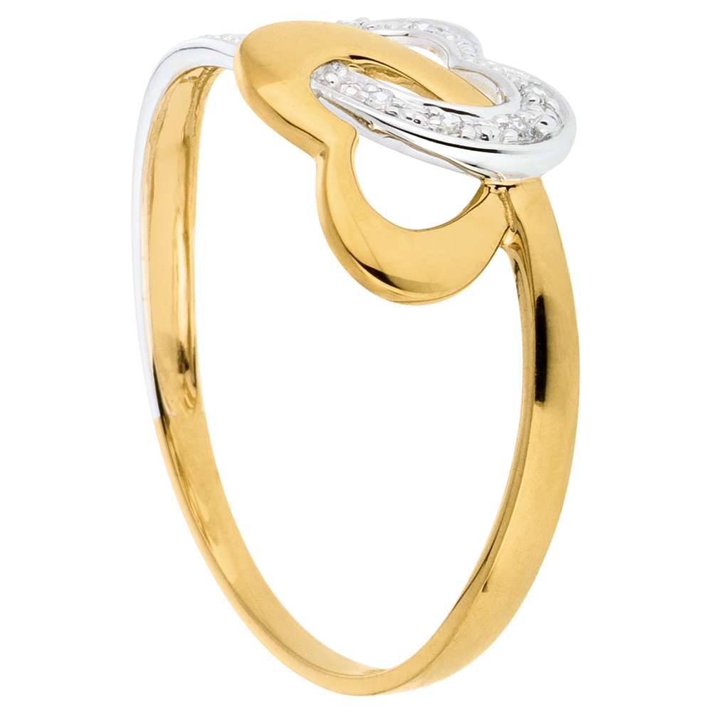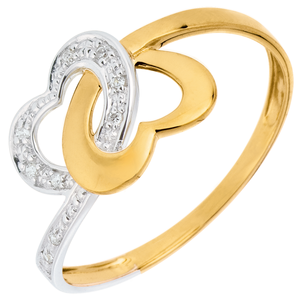 Zwei verliebte Herzen aus Gold vereinen sich. Zur Hälfte mit Diamanten besetztes Weißgold, die andere Hälfte besteht aus Gelbgold.