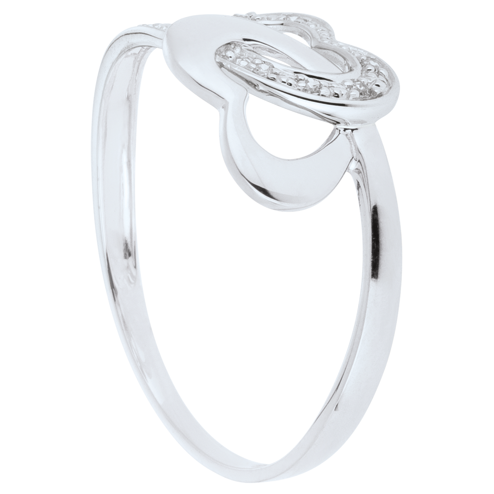 Zwei verliebte Herzen aus Gold vereinen sich. Zur Hälfte mit Diamanten besetztes Weißgold, die andere Hälfte besteht aus Weißgold. 9 Diamanten : 0.03 Karat - Weißgold (750/-): 1.4 g. Weitere Abmessungen