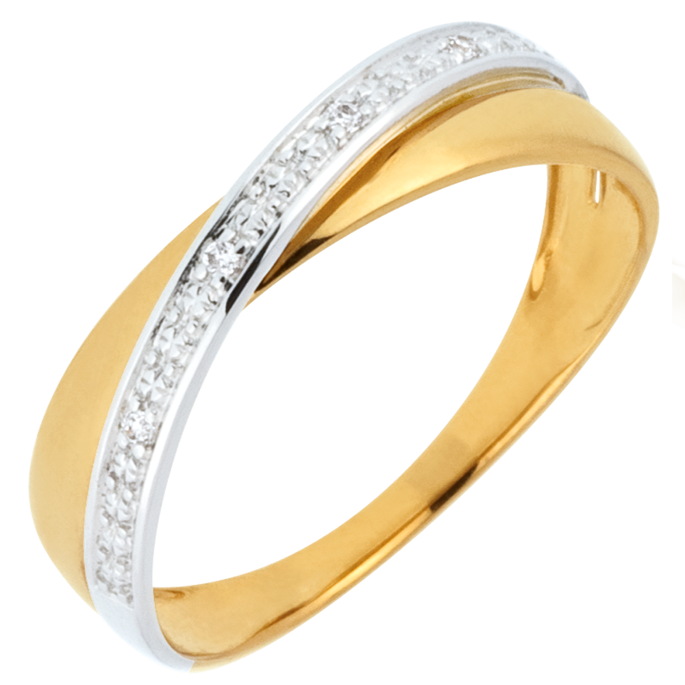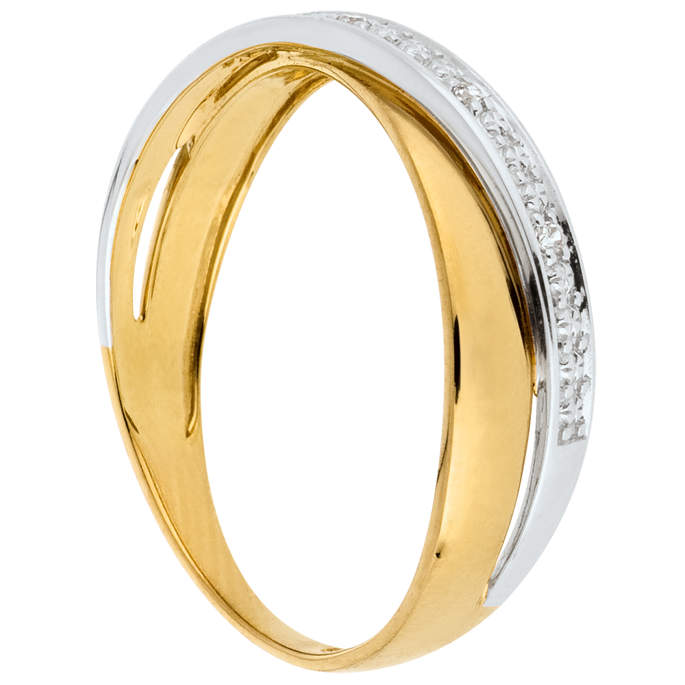 Ein gelbgoldener Ring wird auf elegante Weise von einem brillantbesetzten Band in Weißgold durchquert. 4 Diamanten : 0.02 Karat - Weiß-und Gelbgold (375/-): 1.9 g. Weitere Abmessungen