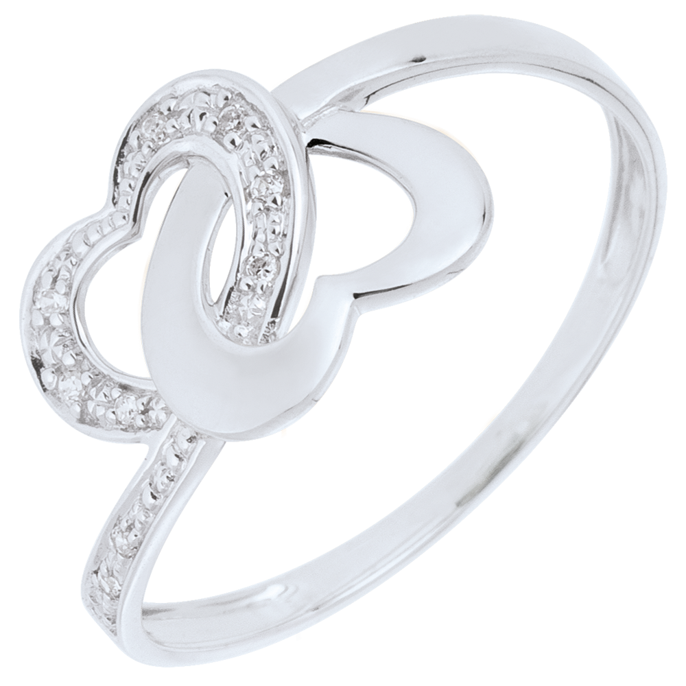 Zwei verliebte Herzen aus Gold vereinen sich. Zur Hälfte mit Diamanten besetztes Weißgold, die andere Hälfte besteht aus Weißgold.