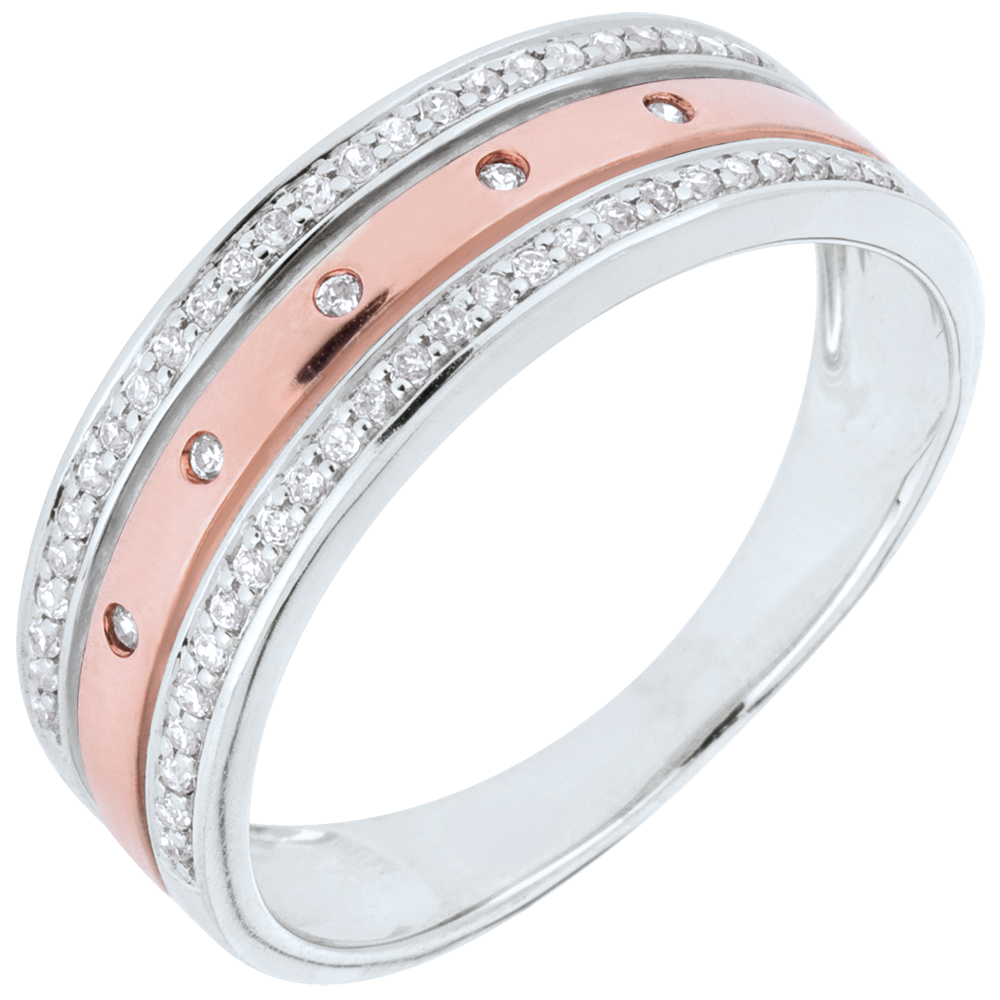 Zwei diamantbesetze Ringe in Weißgold umrahmen einen zentralen Ring in Roségold, welcher mit fünf erlesenen Diamanten geschmückt ist. 55 Diamanten : 0.18 Karat - Weiß-und Rotgold (375/-): 2.1 g. Weitere Abmessungen