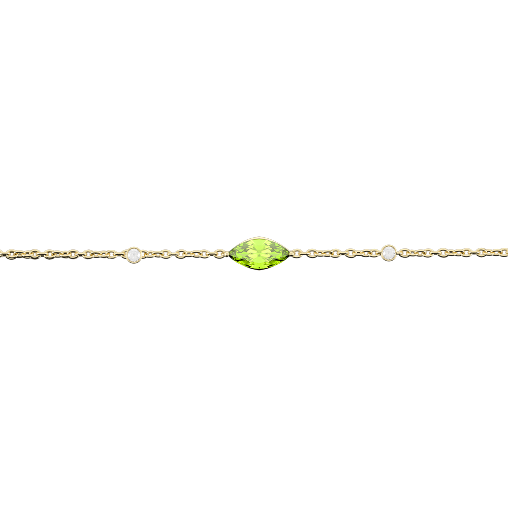 Der kostbare Augapfel, welcher durch einen Peridot verkörpert wird, thront in der Mitte dieses zarten Armbands in Gelbgold. Er wird von zwei edlen Diamanten umgeben, die beinahe wie zwei Tränen in der Ewigkeit festgehalten sind.