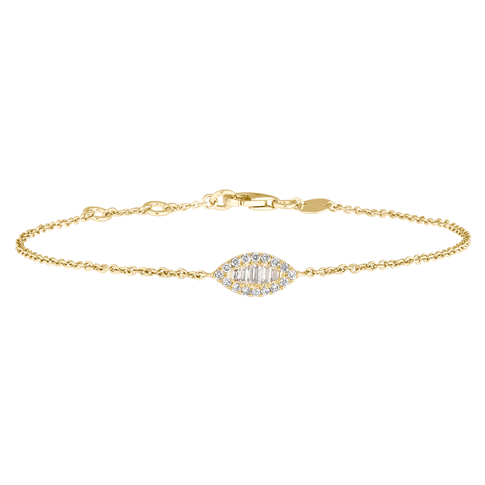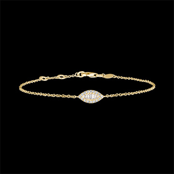 Ein feines, feminines Armband mit Formen, die sich von orientalischen Märchen inspirieren. Das Motiv der Gelbgoldkette aus fünf Baguette-Diamanten wird durch das Diamanten-Pavé in Mandelform zart hervorgehoben. Längenverstellbares Armband: 18cm, 17cm, 16cm.