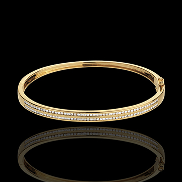 Ein zartes Band aus Gelbgold ist mit zwei dezent funkelnden Diamantenreihen besetzt. Höhe: 5mm und Dicke: 2mm. 98 Diamanten : 0.69 Karat - Gelbgold (750/-): 10.6 g.