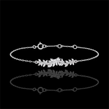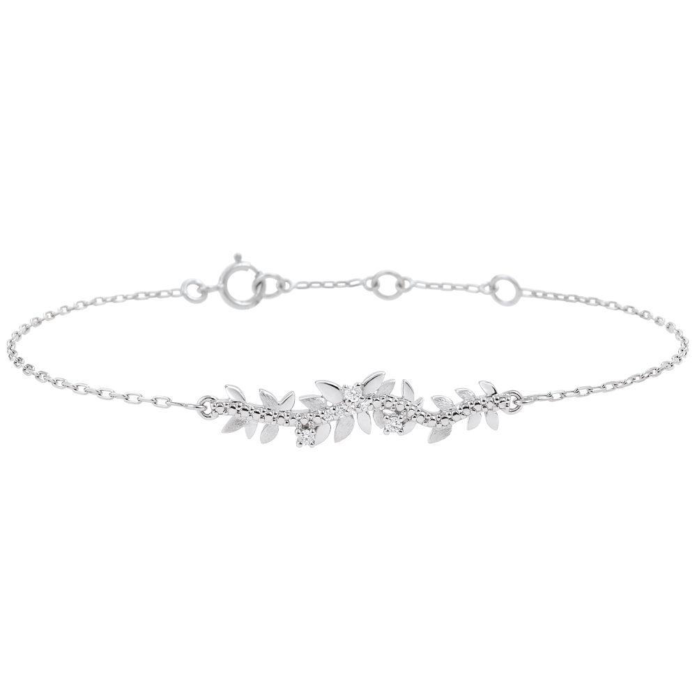 Ein romantisches Zusammenspiel aus glänzendem und eismattem Weißgold, welche sich in den verschiedenen Blattformen dieses mit sieben Diamanten besetzten Armbands wiederfinden. Längenverstellbares Armband: 18, 17 und 16 Zentimeter. Motivmaße: 30 mm Länge et 5 mm Breite. 7 Diamanten : 0.05 Karat - Weißgold (750/-): 2.2 g. Weitere Abmessungen