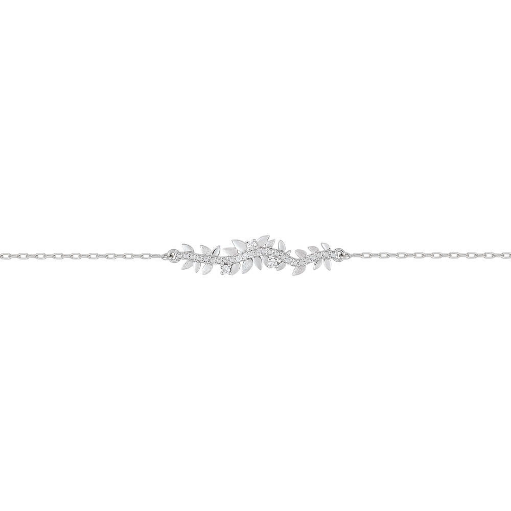 Ein romantisches Zusammenspiel aus glänzendem und eismattem Weißgold, welche sich in den verschiedenen Blattformen dieses mit sieben Diamanten besetzten Armbands wiederfinden. Längenverstellbares Armband: 18, 17 und 16 Zentimeter. Motivmaße: 30 mm Länge et 5 mm Breite. 7 Diamanten : 0.05 Karat - Weißgold (375/-): 1.6 g. Weitere Abmessungen