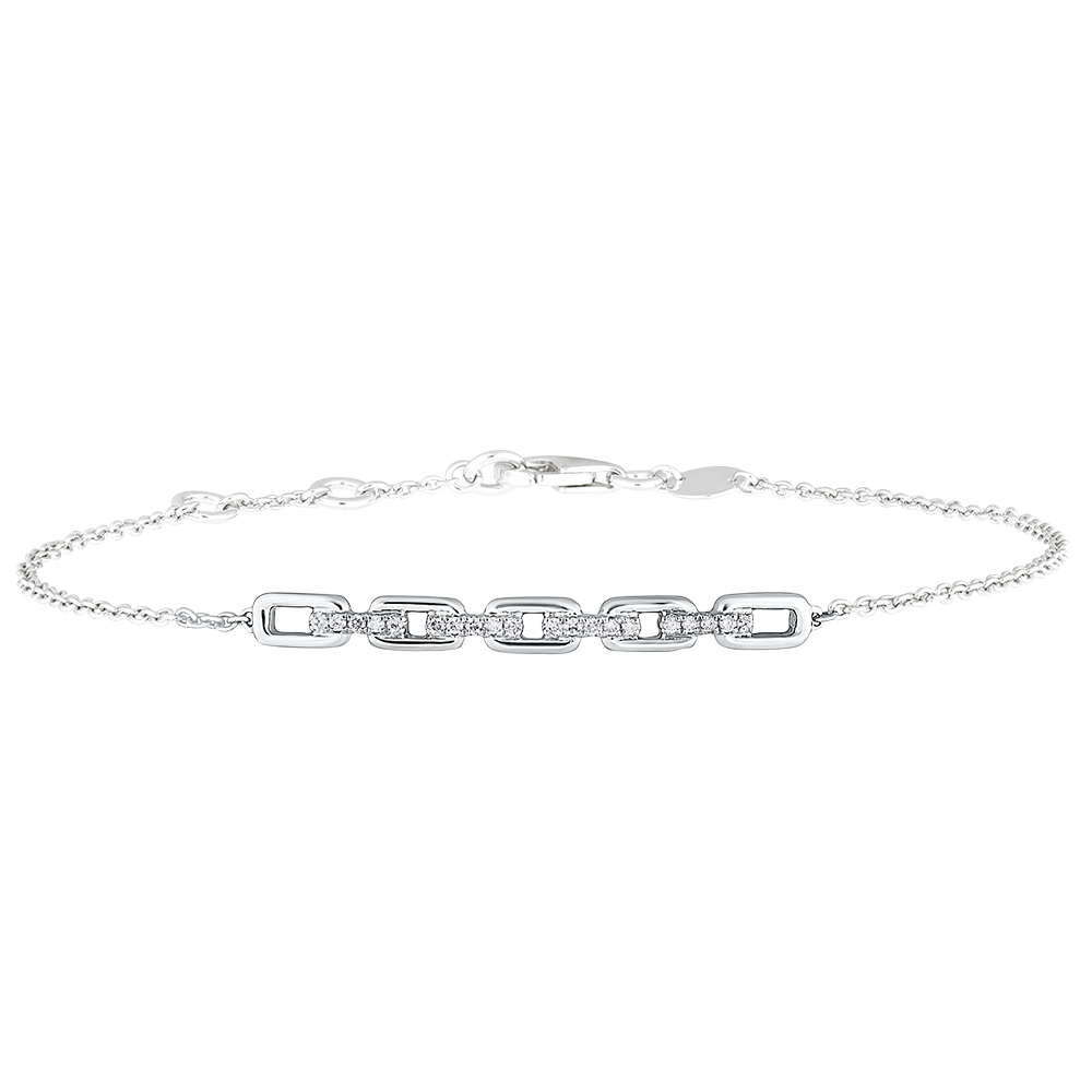 Ein klassisches Weißgoldarmband in neuem Gewand: Fünf großzügige, mit Diamanten besetzte kubanische Kettenglieder kontrastieren mit dem zarten Kettchen. Längenverstellbares Armband: 18cm, 17cm, 16cm. 20 Diamanten : 0.08 Karat - Weißgold (750/-): 2.6 g. Weitere Abmessungen
