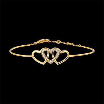 Ein Armreif mit einem zart und romantisch verschlungenen Herz-Trio, eine leichte Melange aus Gelbgold und Diamanten. Armreif mit praktischem Kettenverschluss. 20 Diamanten : 0.13 Karat - Gelbgold (375/-): 3.7 g. Weitere Abmessungen