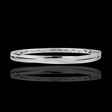 Die Besonderheit dieses Armreifs rührt aus der harmonischen Verbindung von drei Ringen in Weißgold, die von einem diamantbesetztem Band durchzogen werden. Breite: 5mm - Dicke: 2.5mm - Durchmesser: 60mm. 51 Diamanten : 0.36 Karat - Weißgold (375/-): 7.2 g. Weitere Abmessungen