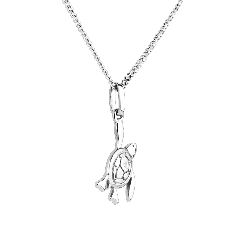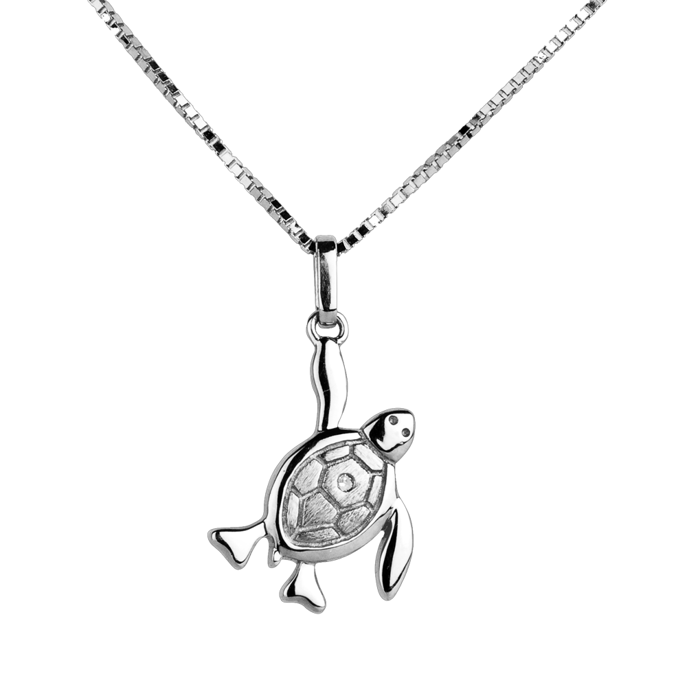 Eine kleine Schildkröte auf dem Weg zum Meer. Ihr weißgoldener Panzer aus ist mit einem erlesenen Diamanten besetzt. Großes Modell. Ohne Kette. 1 Diamant : 0.05 Karat - Weißgold (750/-): 1.2 g. Weitere Abmessungen