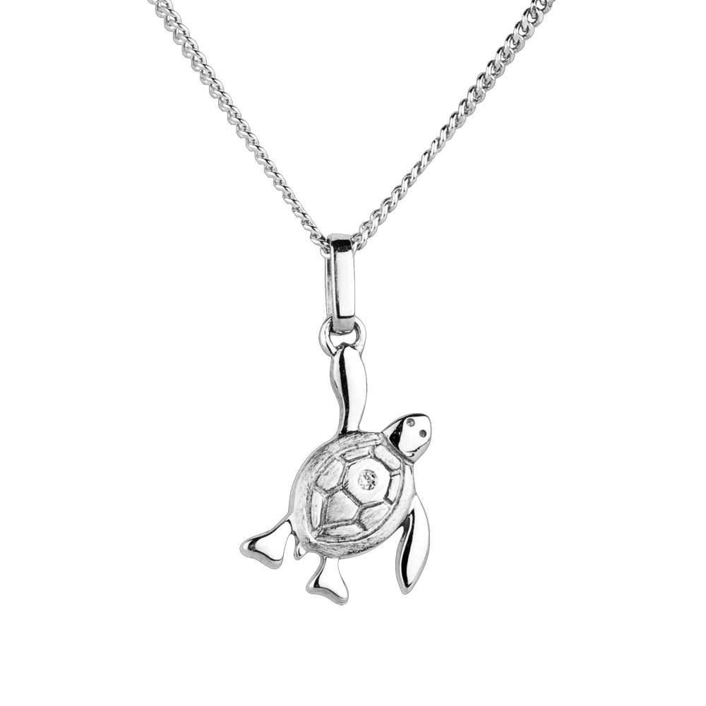 Eine kleine Schildkröte auf dem Weg zum Meer. Ihr weißgoldener Panzer aus ist mit einem erlesenen Diamanten besetzt. Kleines Modell. Ohne Kette. 1 Diamant : 0.03 Karat - Weißgold (750/-): 0.7 g. Weitere Abmessungen