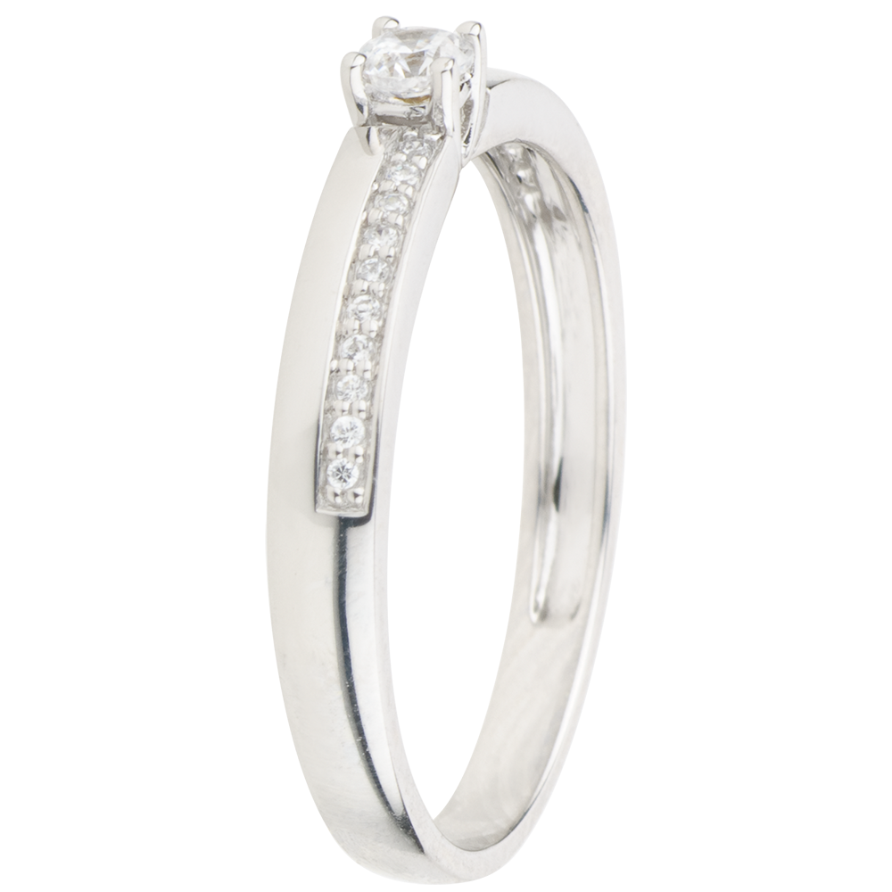 Ein Diamant Solitär wird in eine asymmetrische von Diamanten eingearbeitete Aushöhlung eingebettet, um ihm die Eleganz der Originalität zu verleihen. 21 Diamanten : 0.14 Karat - Weißgold (750/-): 2.1 g. Weitere Abmessungen