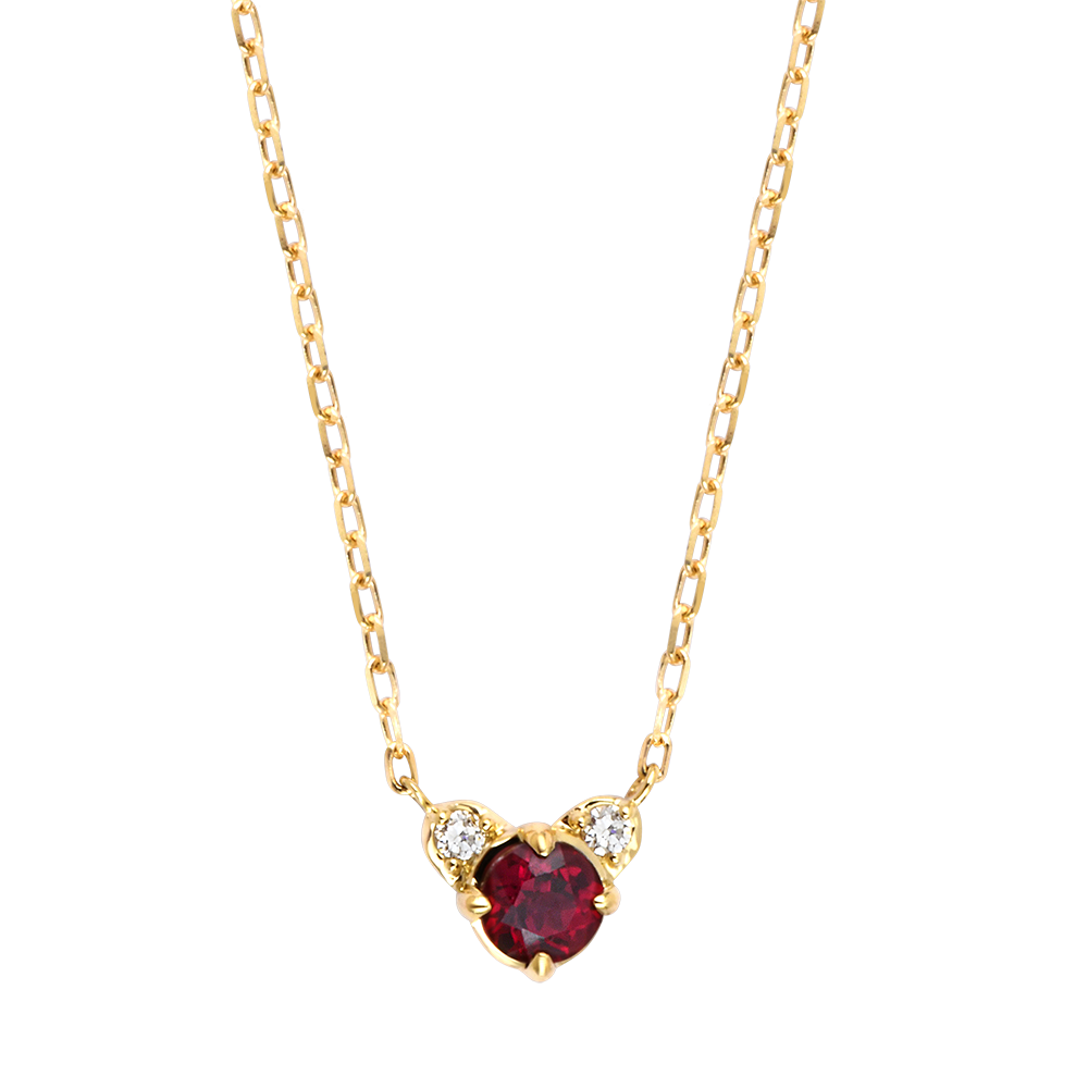 Ein leuchtender Rubin, flankiert von zwei funkelnden Diamanten, bildet ein lichtvolles Trio in zarter Herzform.Ein filigranes und feminines Schmuckstück – wie ein Hauch von Zärtlichkeit, der Ihren Hals umschmeichelt.