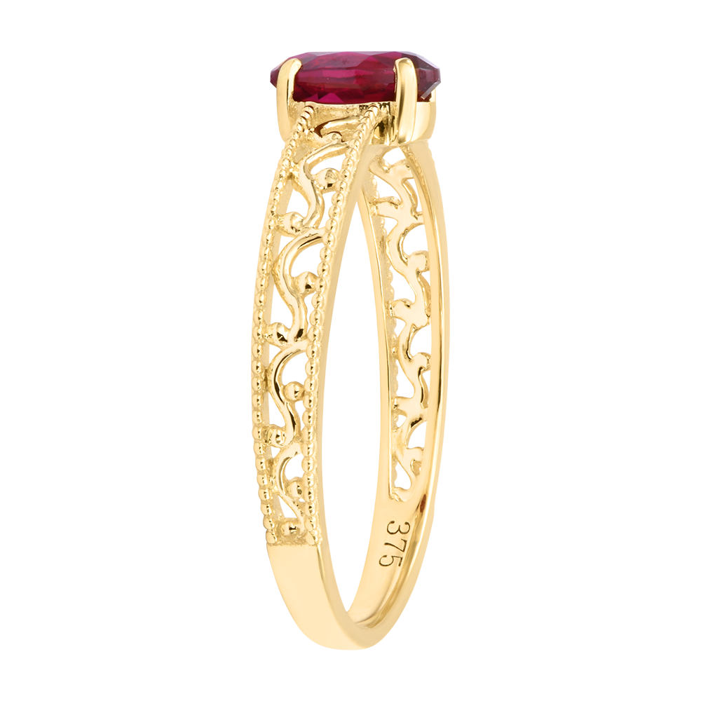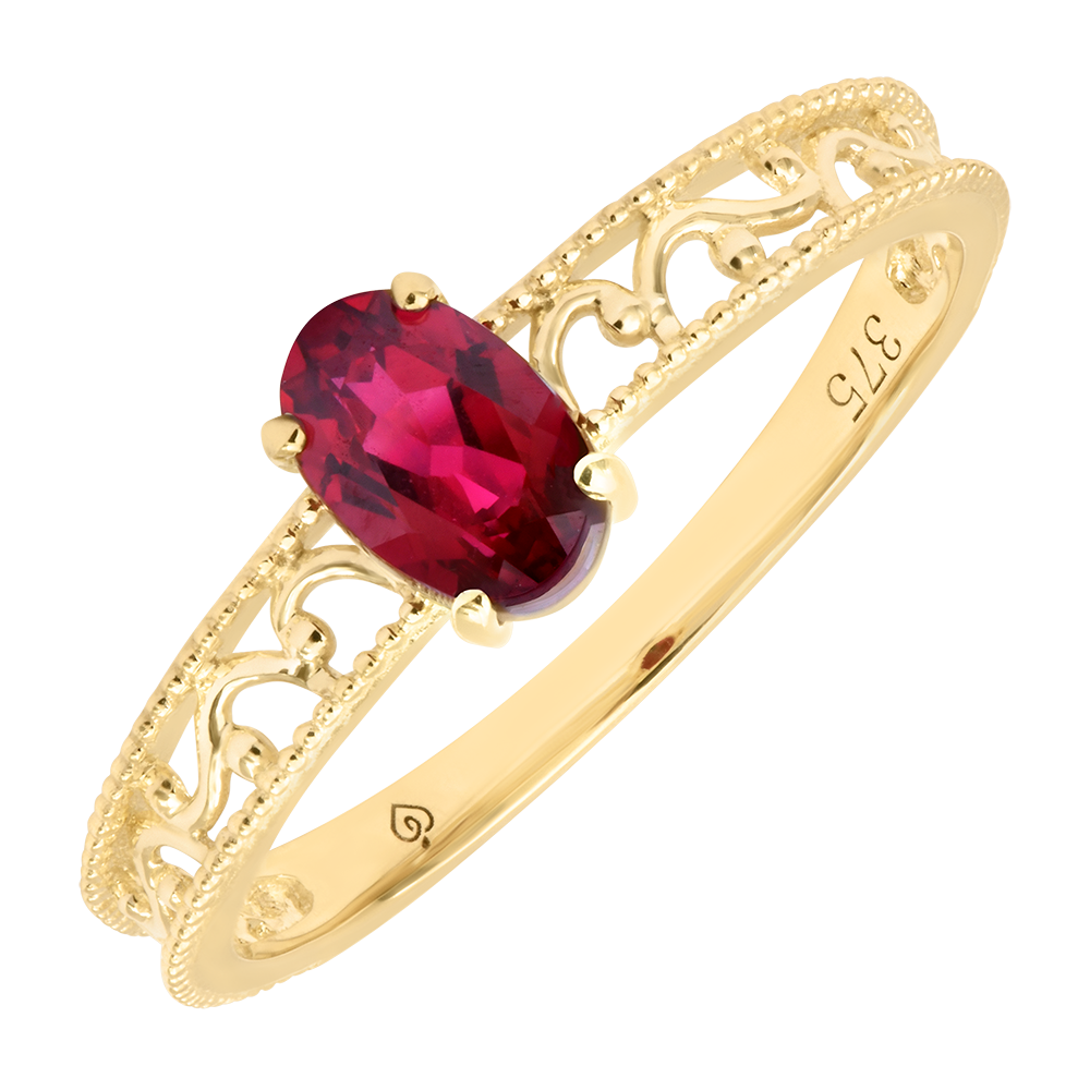 Ein funkelnder 0,5-Karat-Rubin schmückt die Mitte eines zart durchbrochenen Rings mit fein gravierten, floralen Details.Ein Schmuckstück voller romantischer Anmut – wie ein Liebesschwur, der im Licht verewigt ist. Gelbgold (375/-): 1.1 g. Synthetischer Rubin : 1 - Total: 0.5 KaratWeitere Abmessungen