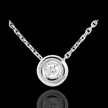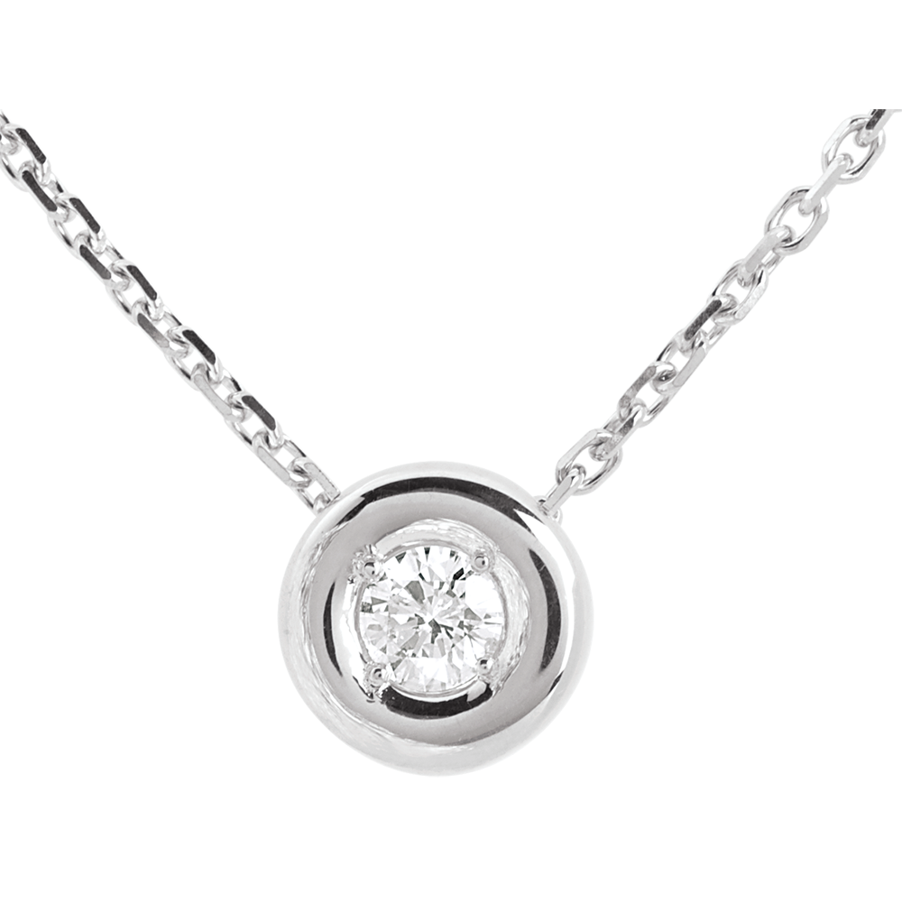 Ein funkelnder Diamant lieblich eingefasst in einen zarten Rahmen aus Weissgold. Mit Goldkette 750/1000: 40 cm. Mit Kette 42 cm + Verlängerung von 3 cm; 750/-. 1 Diamant : 0.15 Karat - Weißgold (750/-): 2 g. Weitere Abmessungen