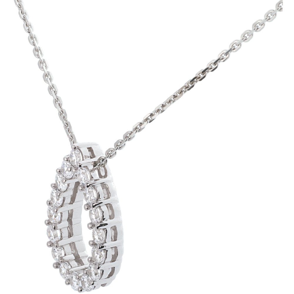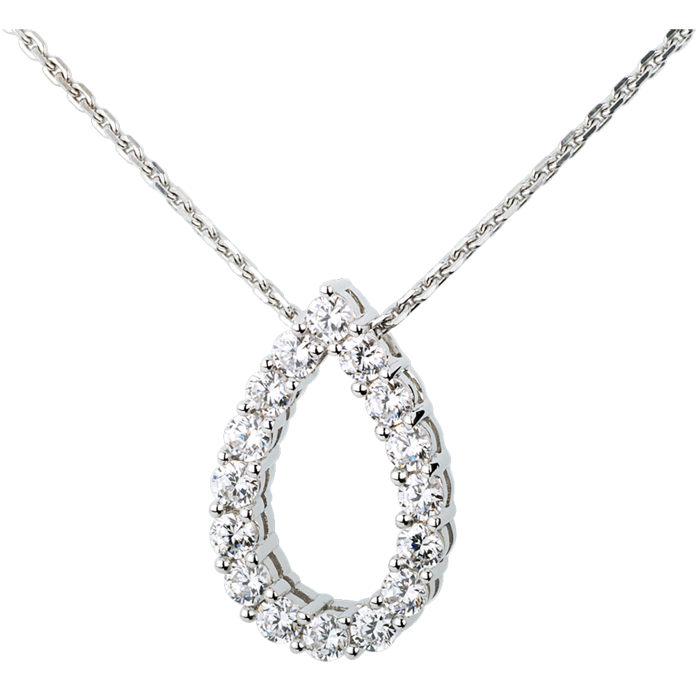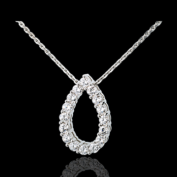 Ein Klagelied der Liebe in Form einer glitzernden Träne. Dieses schöne Diamantcollier verkörpert Süsse und Zartheit. Mit Goldkette 750/1000. Mit Kette 42 cm + Verlängerung von 3 cm; 750/-. 16 Diamanten : 1.05 Karat - Weißgold (750/-): 5.3 g. Weitere Abmessungen