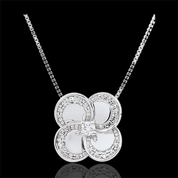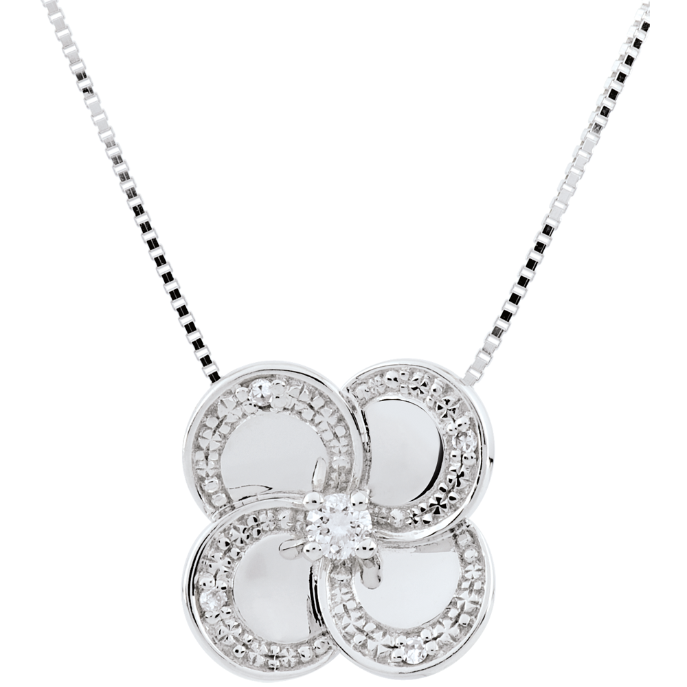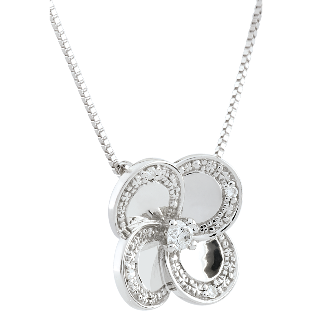 Dieses moderne vierblättrige Kleeblatt hebt sich durch seine polierte Oberfläche hervor Das besondere Detail bei diesem Schmuckstück bleibt unumstritten seine Kontur, welche von kleinen Diamanten begleitet wird.
