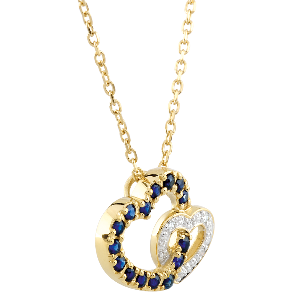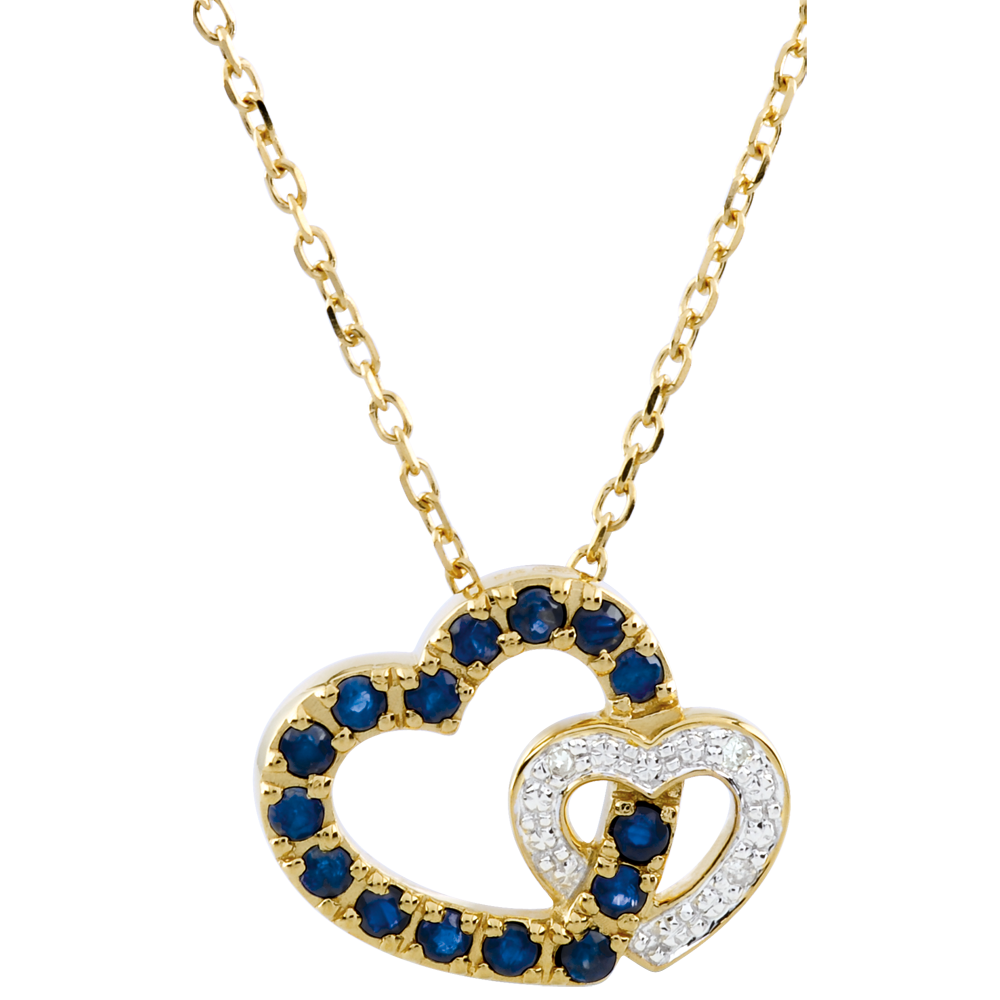 Ein Herzduo, besetzt mit Saphiren und Diamanten. Mit Kette 42 cm + Verlängerung von 3 cm; 375/-. 3 Diamanten : 0.01 Karat - Weiß-und Gelbgold (375/-): 2.1 g. Blauer Saphir : 15 - Total: 0.35 Karat Weitere Abmessungen