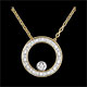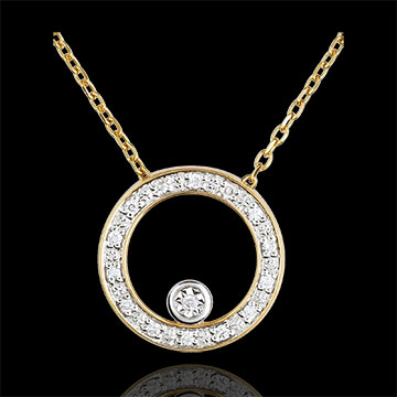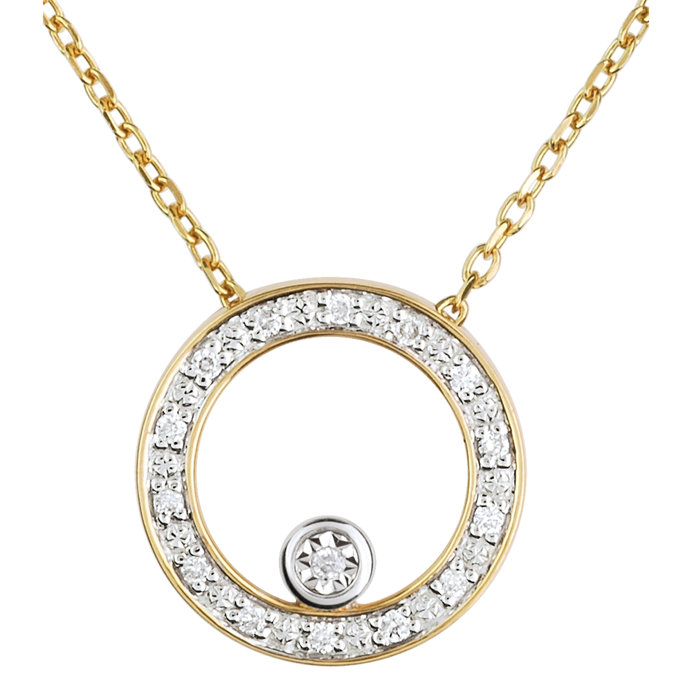 Ein mit Diamanten bestreuter Kreis aus Gelbgold, trägt einen Diamanten. Das Collier enthält eine Kette aus Gelbgold. Zeitlos und elegant für jeden Anlass. Mit Kette 42 cm + Verlängerung von 3 cm; 375/-. 15 Diamanten : 0.08 Karat - Gelbgold (375/-): 2.1 g. Weitere Abmessungen