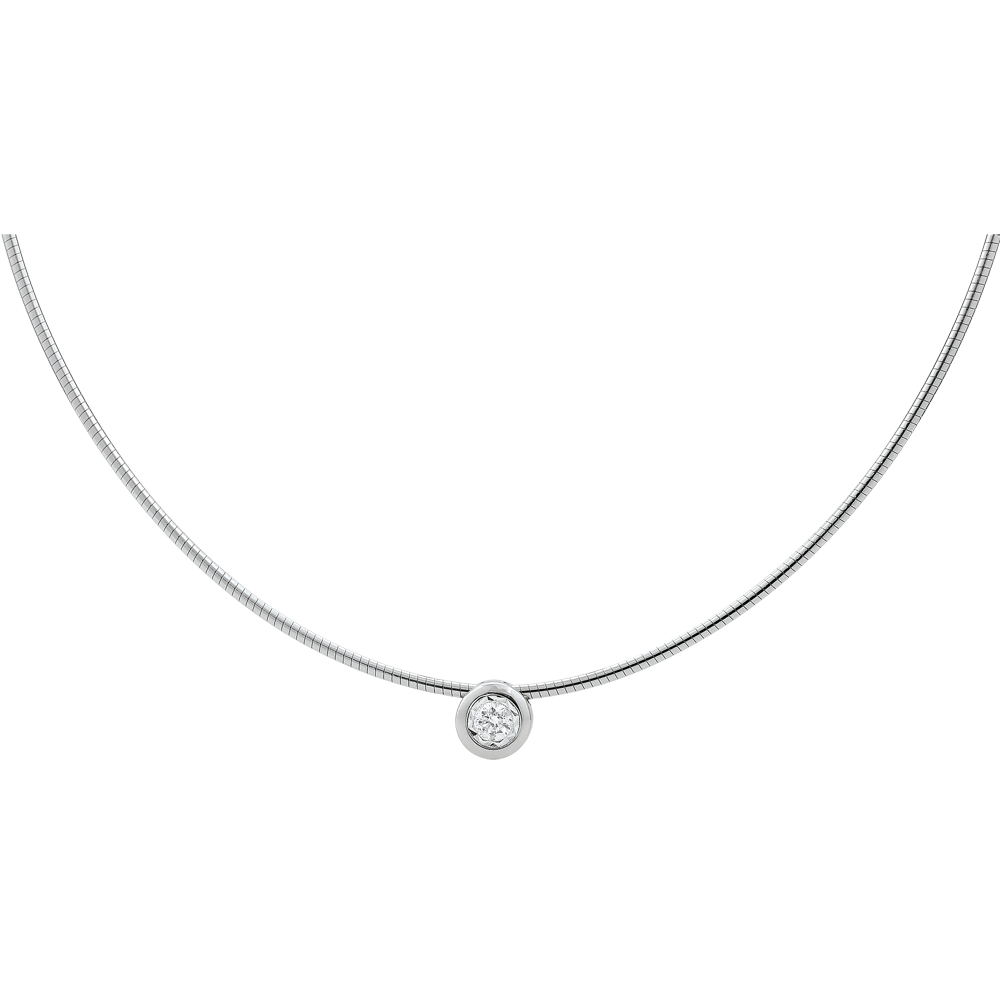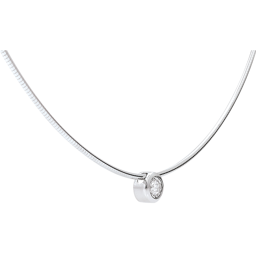 Ein starkes Collier aus Weissgold hält einen strahlenden Diamanten, klassisch und elegant.