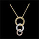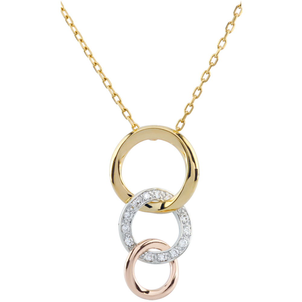 Eine Kreistrilogie in unendlicher Bewegung - im inneren mit Diamanten besetzt. Mit Kette 42 cm + Verlängerung von 3 cm; 375/-. 13 Diamanten : 0.06 Karat - Tricolor (375/-): 2.2 g. Weitere Abmessungen