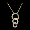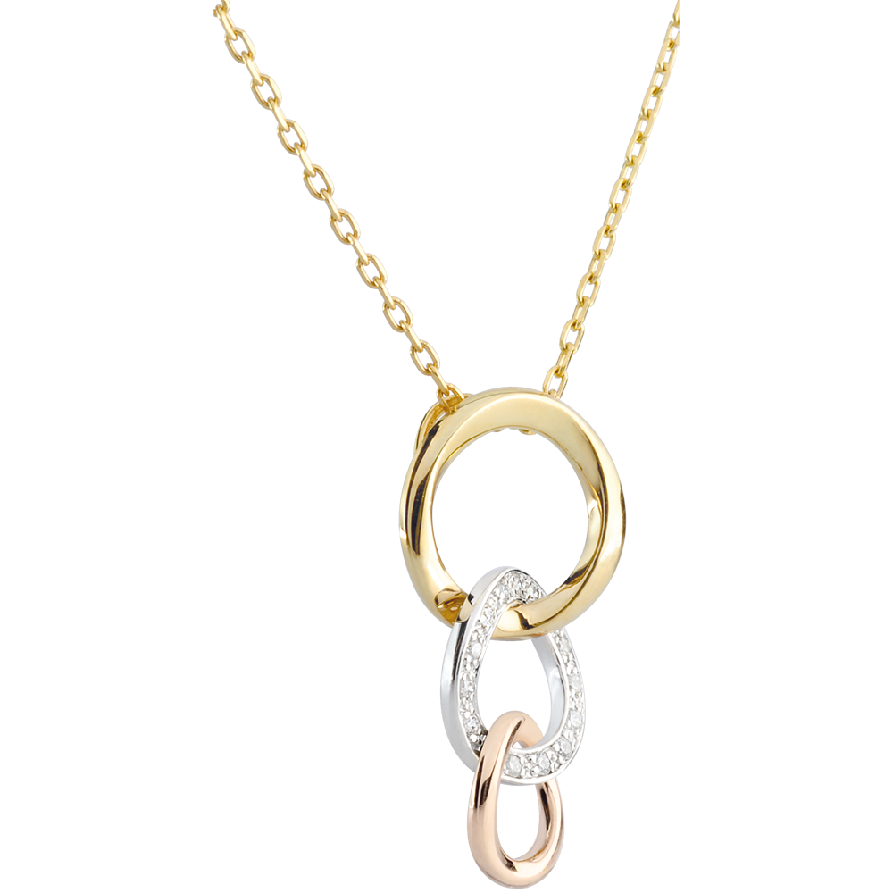 Eine Kreistrilogie in unendlicher Bewegung - im inneren mit Diamanten besetzt. Mit Kette 42 cm + Verlängerung von 3 cm; 750/-. 13 Diamanten : 0.06 Karat - Tricolor (750/-): 3 g. Weitere Abmessungen