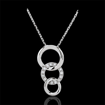 Eine Kreistrilogie in unendlicher Bewegung - im inneren mit Diamanten besetzt. Mit Kette 42 cm + Verlängerung von 3 cm; 750/-. 13 Diamanten : 0.06 Karat - Weißgold (750/-): 3 g. Weitere Abmessungen