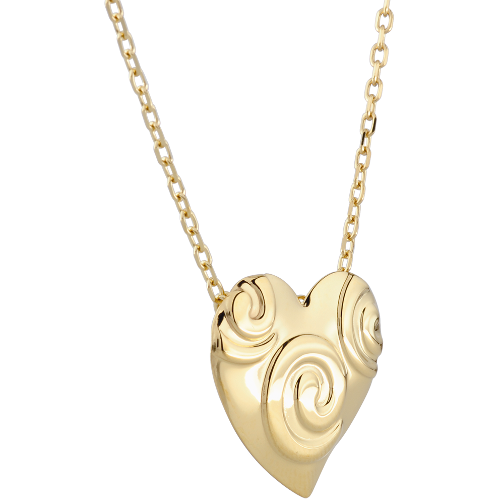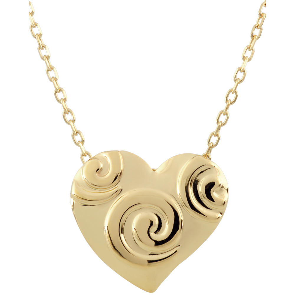 Ein Herz verziert mit Spiralen für ein originelles Collier. Mit Goldkette 375/-. Mit Kette 42 cm + Verlängerung von 3 cm; 375/-. Gelbgold (375/-): 1.7 g. Weitere Abmessungen