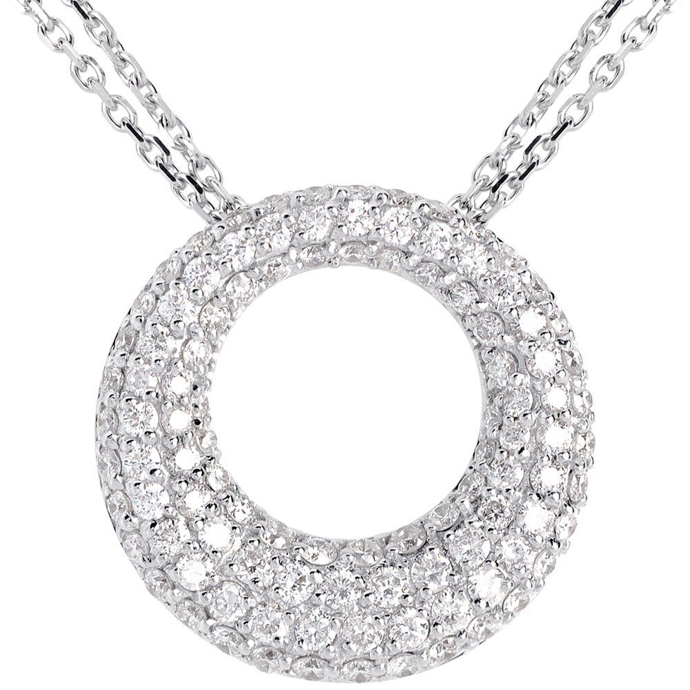 Dieses überwältigende Collier in Ringform, besetzt mit strahlenden Diamanten, schmückt eine Doppelkette aus Weissgold. Mit Goldkette 750/1000. Mit Kette 42 cm + Verlängerung von 3 cm; 750/-. 104 Diamanten : 1.55 Karat - Weißgold (750/-): 6.5 g. Weitere Abmessungen