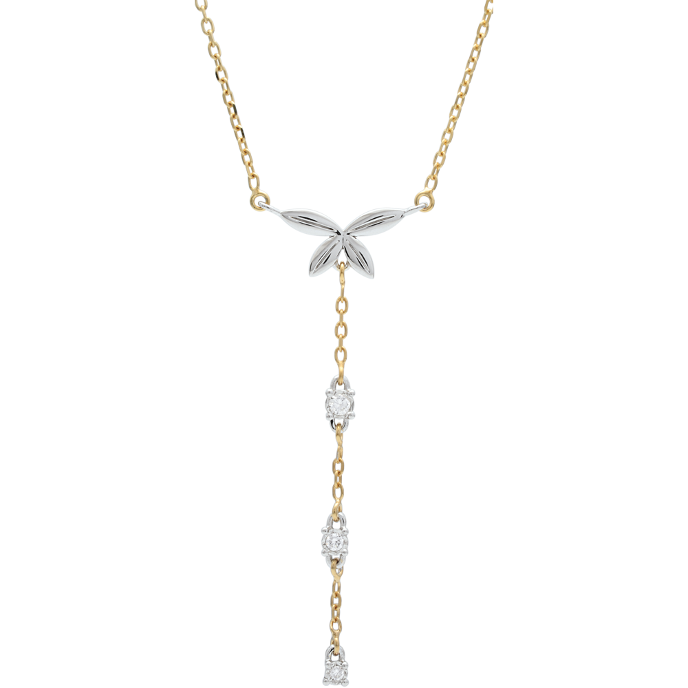 Ein zartes Blattwerk mit drei hängenden Diamanten. Mit Kette 42 cm + Verlängerung von 3 cm; 375/-. 3 Diamanten : 0.06 Karat - Weiß-und Gelbgold (375/-): 1.7 g. Weitere Abmessungen