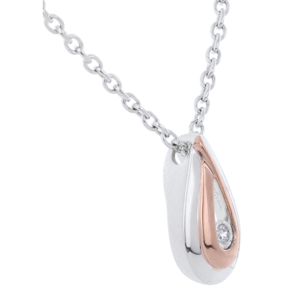 Ein zweifarbiger Tropfen in Weiß- und Roségold, in dessen Mitte ein edler Diamant strahlt, ziert eine elegante Kette in Weißgold.