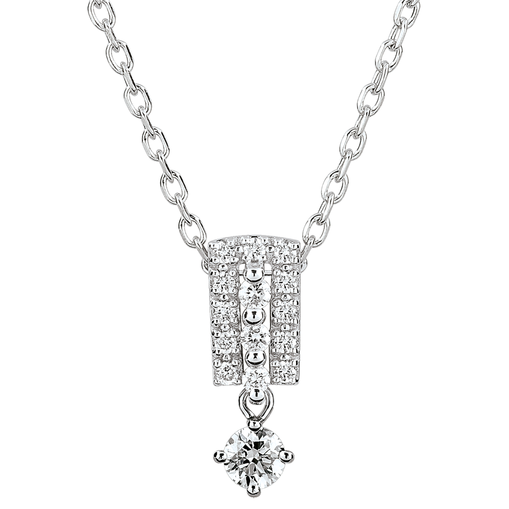 Die kostbare Fassung aus drei diamantbesetzten Reihen umschließt einen zentralen Diamanten. Mit Kette 42 cm + Verlängerung von 3 cm; 375/-. 15 Diamanten : 0.17 Karat - Weißgold (375/-): 1.9 g. Weitere Abmessungen