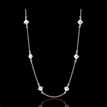 Inspiriert von der eindrucksvollen Form eines Rohdiamanten, wirken diese Pyramidenmotive elegant und modern zugleich. Als besonderes Detail präsentiert sich ein edler Diamant, der eine ihrer Facetten schmückt. Mit Kette 42 cm + Verlängerung von 3 cm; 750/-. 6 Diamanten : 0.02 Karat - Weiß-und Rotgold (750/-): 2.9 g. Weitere Abmessungen