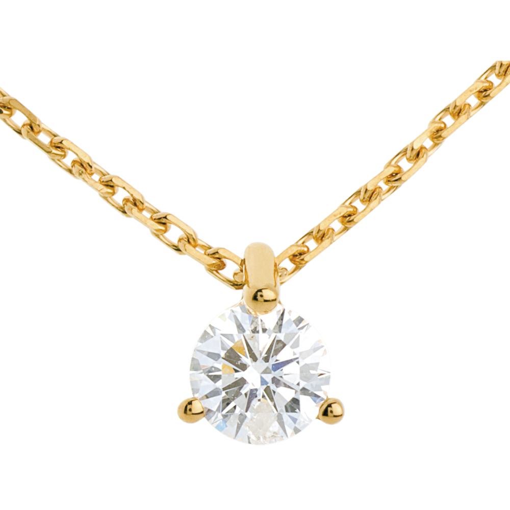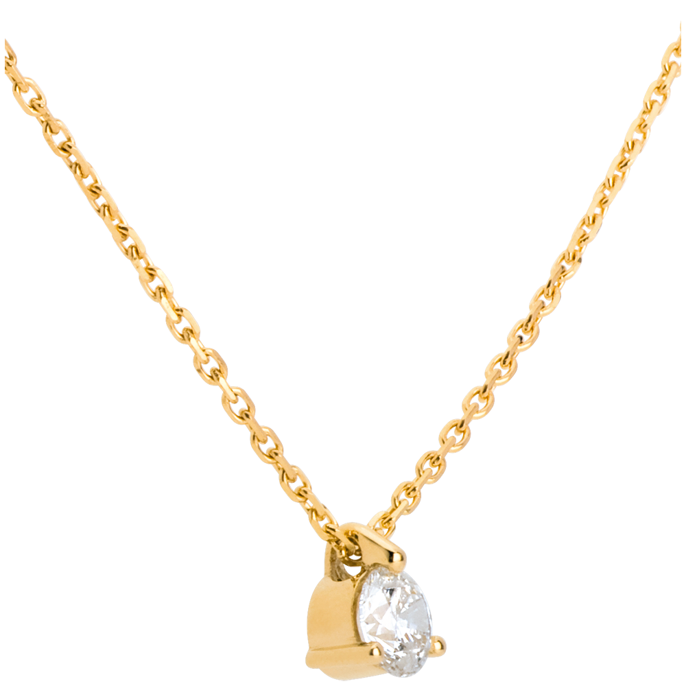 Der funkelnde Diamant in einer 3er Krappenfassung aus Gelbgold verkörpert zarte Eleganz. Mit Goldkette 750/1000 42 cm. Mit Kette 42 cm + Verlängerung von 3 cm; 750/-. 1 Diamant : 0.26 Karat - Gelbgold (750/-): 1.5 g. Weitere Abmessungen