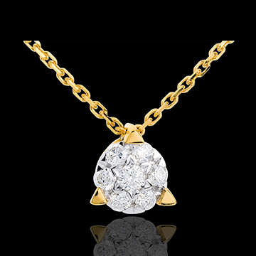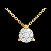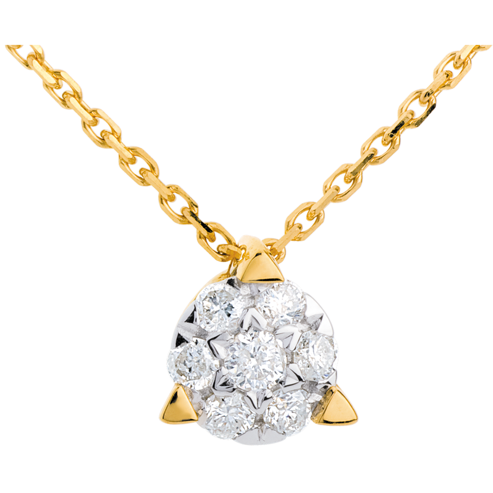 Der funkelnde Diamant in einer 3er Krappenfassung aus Gelbgold verkörpert zarte Eleganz. Mit Goldkette 750/1000. Mit Kette 42 cm + Verlängerung von 3 cm; 750/-. 7 Diamanten : 0.18 Karat - Gelbgold (750/-): 2.2 g. Pavé aus natürlichen Diamanten : - Weitere Abmessungen