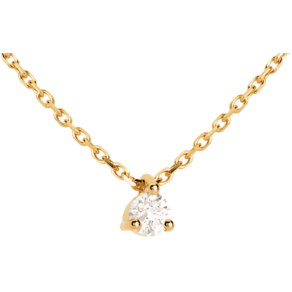 Der funkelnde Diamant in einer 3er Krappenfassung aus Gelbgold verkörpert zarte Eleganz. Mit Goldkette 750/1000: 42cm. Mit Kette 42 cm + Verlängerung von 3 cm; 750/-. 1 Diamant : 0.11 Karat - Gelbgold (750/-): 1.7 g. Weitere Abmessungen