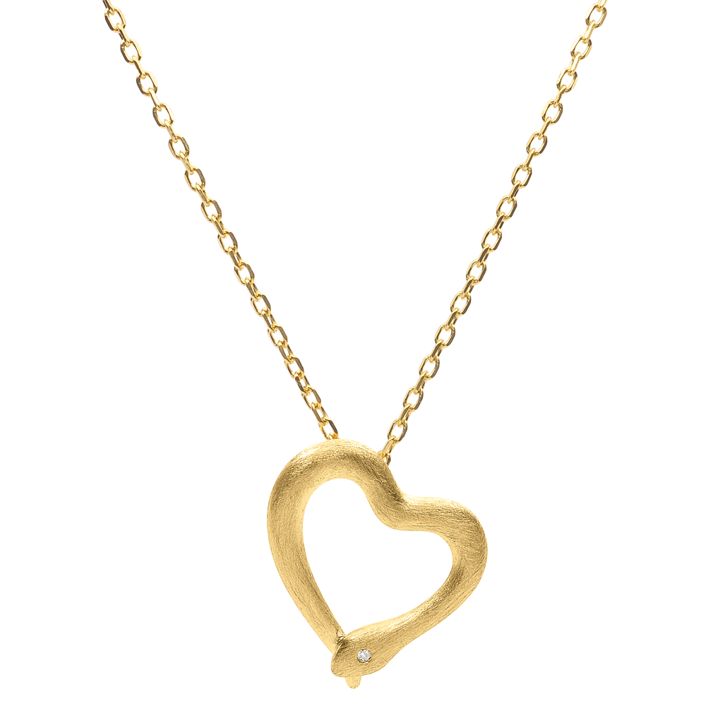 Eine Schlange aus eismattem Gelbgold windet sich um eine zarte und feminine Kette und bildet eine romantische Herzform. Mit Kette 42 cm + Verlängerung von 3 cm; 375/-. 1 Diamant : 0.01 Karat - Gelbgold (375/-): 2.4 g. Weitere Abmessungen