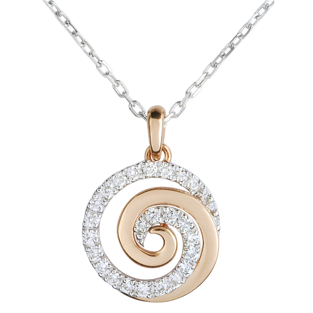 Eine wertvolle Spirale aus Roségold mit Diamanten hängend an einer Kette aus Weißgold. Mit Kette 42 cm + Verlängerung von 3 cm; 750/-. 24 Diamanten : 0.13 Karat - Weiß-und Rotgold (750/-): 2.5 g. Weitere Abmessungen