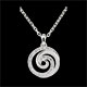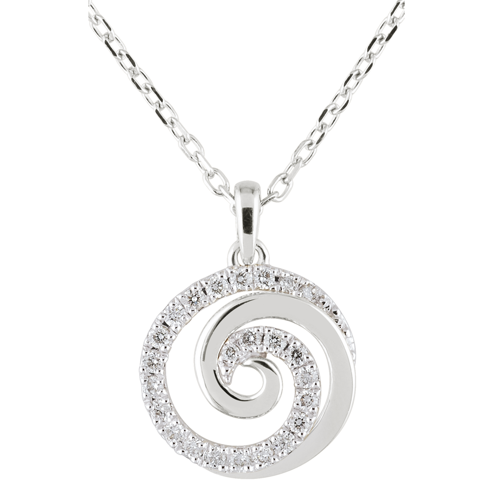 Eine wertvolle Spirale aus Weißgold mit Diamanten hängend an einer Kette aus Weißgold.